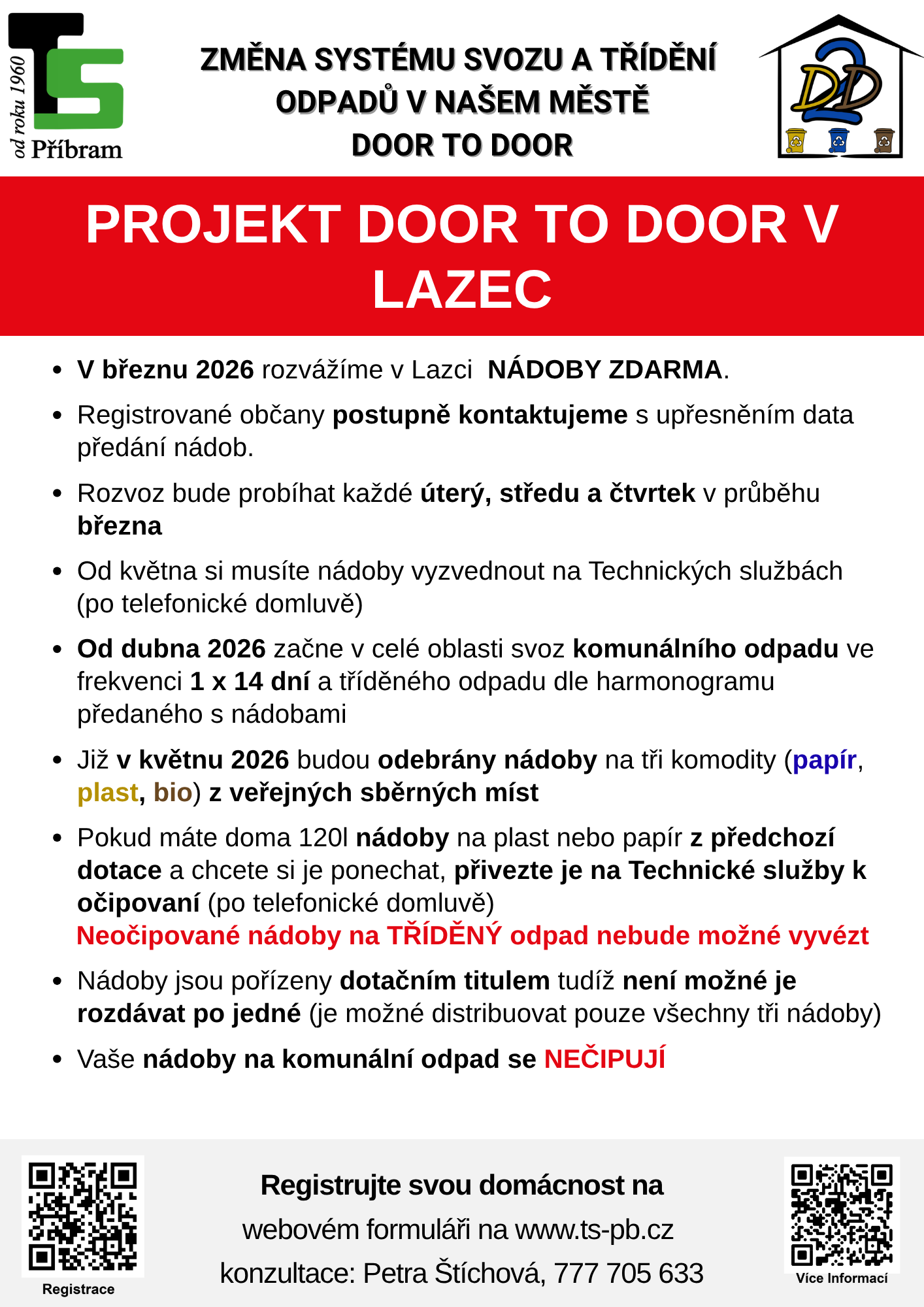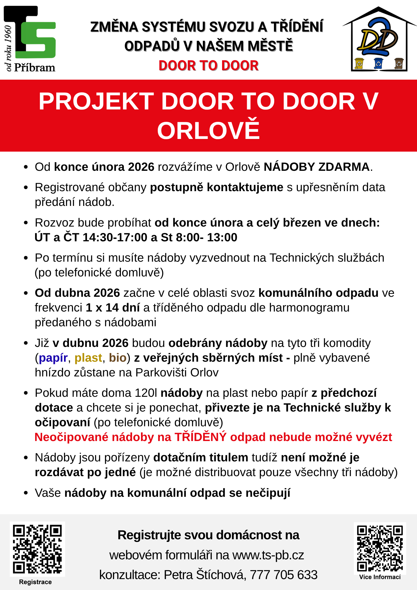 Po tomto termínu si mohou občané nádoby vyzvednout osobně v areálu Technických služeb, a to po předchozí telefonické domluvě s Petrou Štíchovou na tel. 777 705 633.