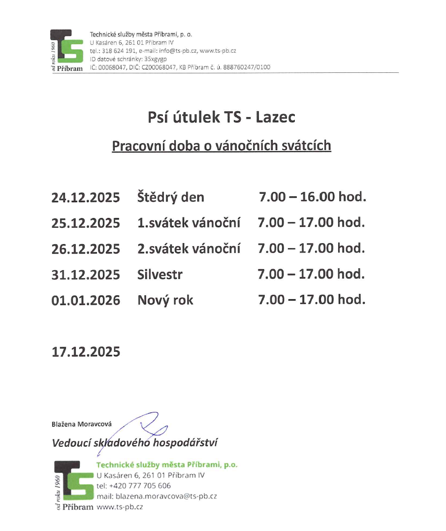 V období vánočních svátků a mezi nimi bude Psí útulek TS – Lazec otevřen v následujících časech: