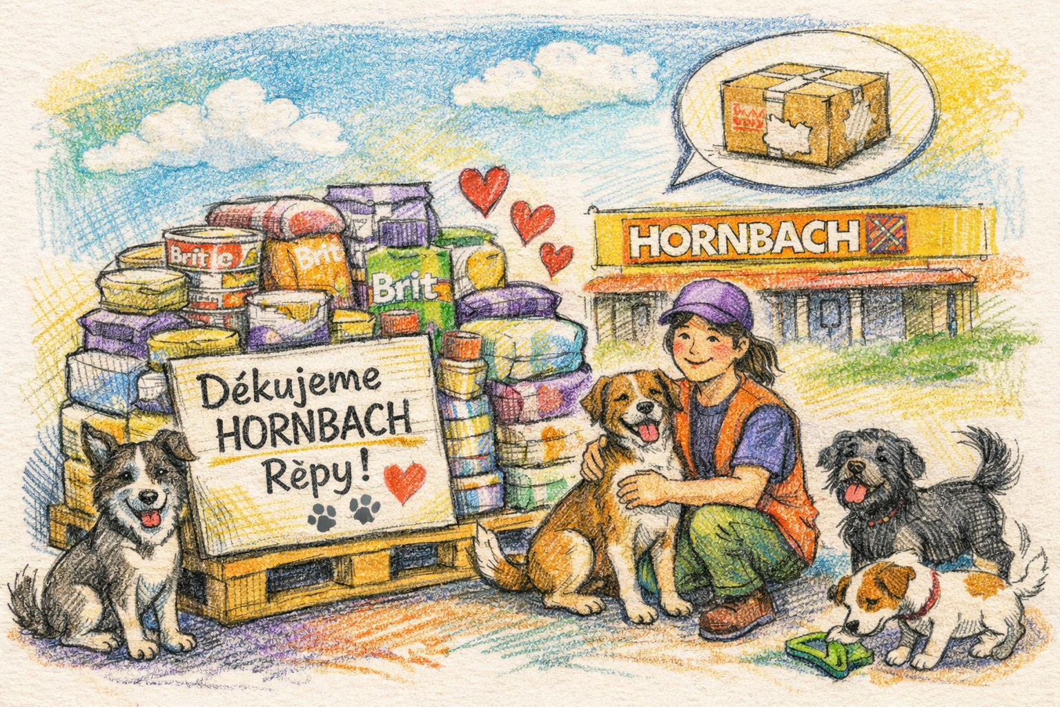 Rádi touto cestou poděkovali obchodnímu středisku HORNBACH Řepy, které dnes poskytlo útulku Lazec významný dar – paleta krmiva Brit a další sortiment pro určený náš pejsky.