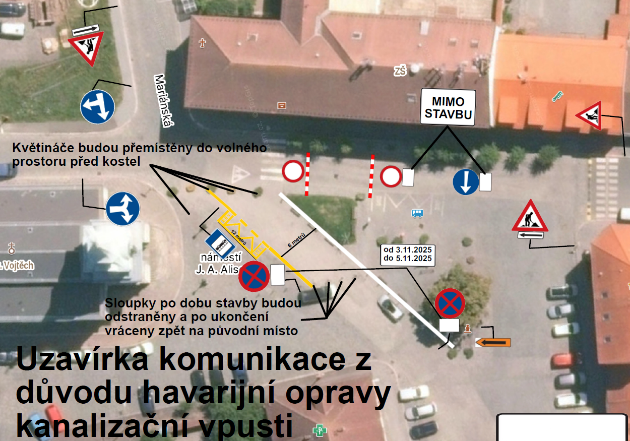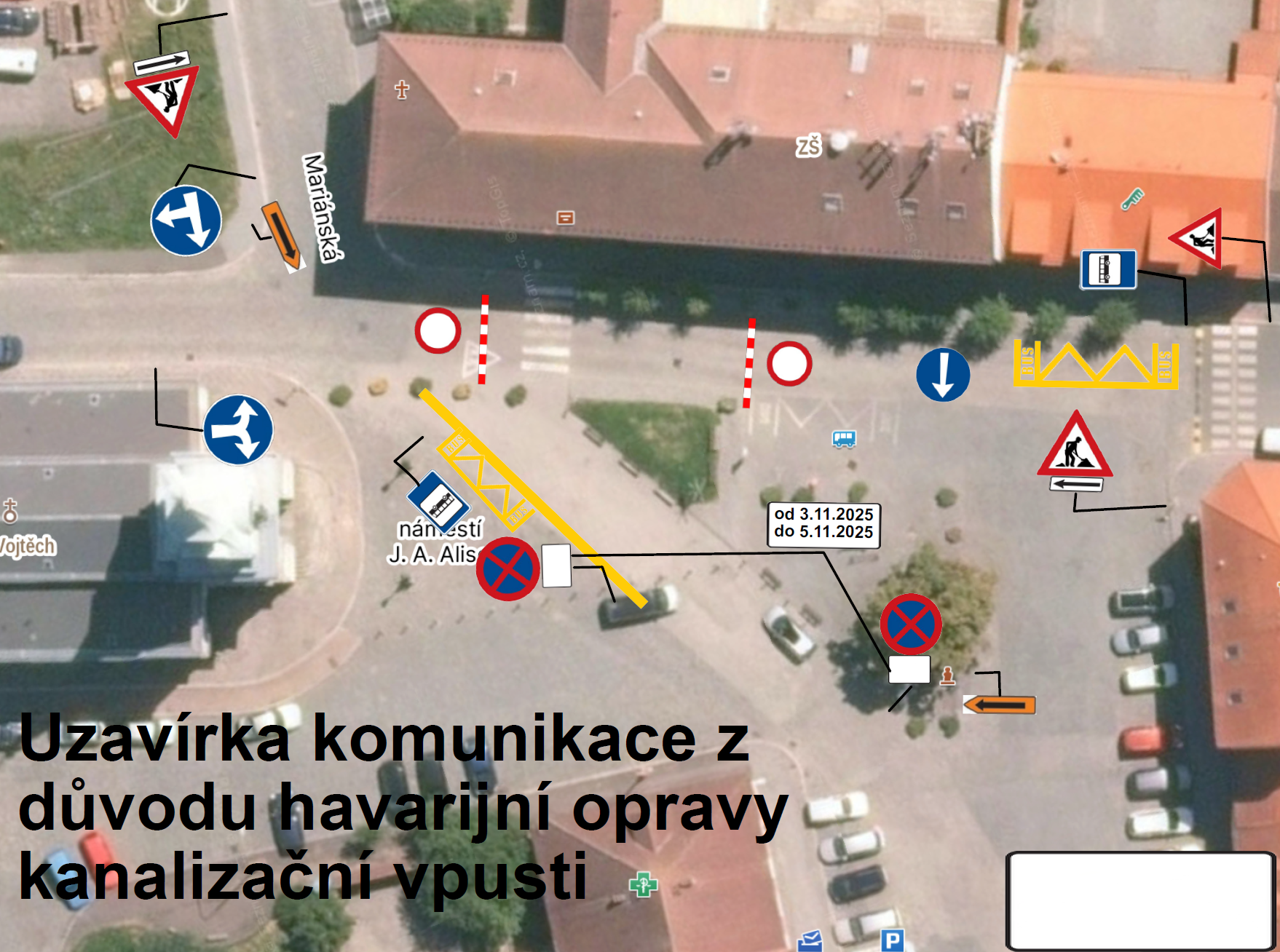 Z důvodu havarijního stavu dešťové kanalizace je v termínu od 3. do 6. listopadu 2025 plánovaná úplná uzavírka části náměstí J. A. Alise.